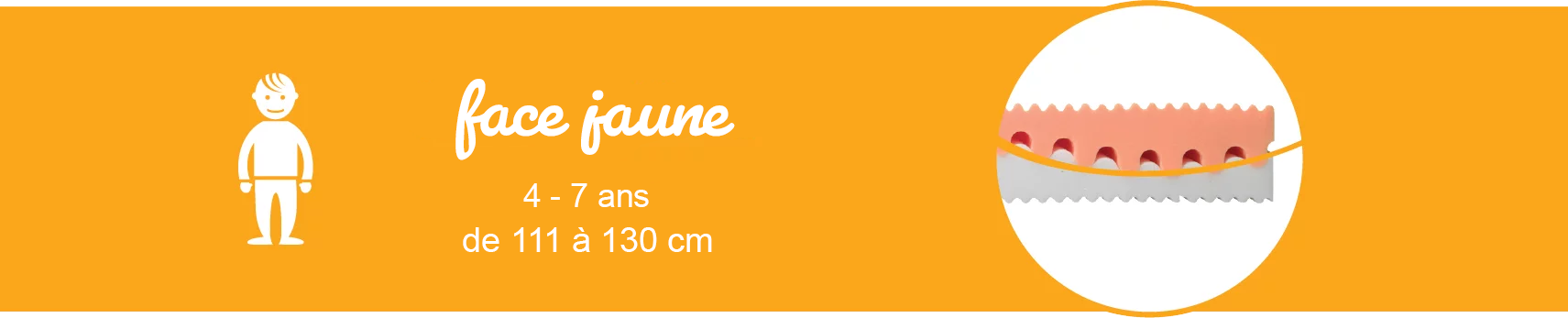 • Étape 2 (4 à 7 ans) : Face Jaune. On pivote le matelas tête-bêche. Les zones de soutien s’ajustent pour mieux répartir le poids d’un enfant qui grandit, notamment au niveau du bassin et des épaules.