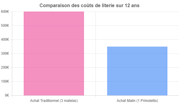 Choisir le matelas évolutif Primoletto, c’est opter pour une consommation plus juste et plus intelligente. En remplaçant 2 à 3 matelas au cours de sa croissance, vous réalisez des économies significatives.