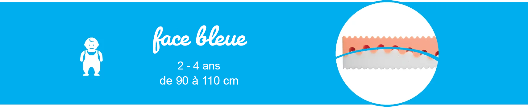 • Étape 1 (2 à 4 ans) : Face Bleue. On commence avec la face souple pour un accueil moelleux, idéal pour le corps des tout-petits.